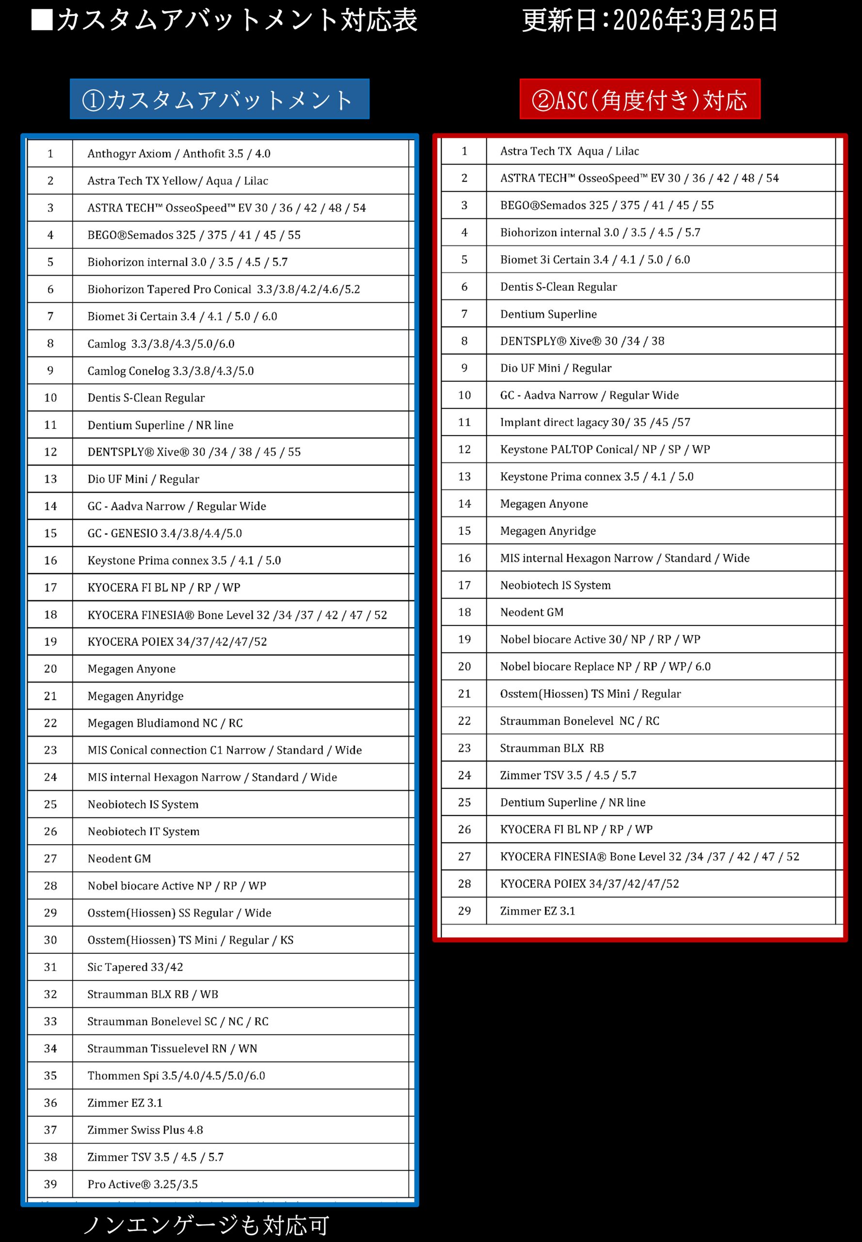 主要メーカーのカスタムアバットメントに幅広く対応。さらにブリッジ用ノンエンゲージにも対応可能です。嵌合部付きデータをいただければ、変換から加工まで対応いたします。